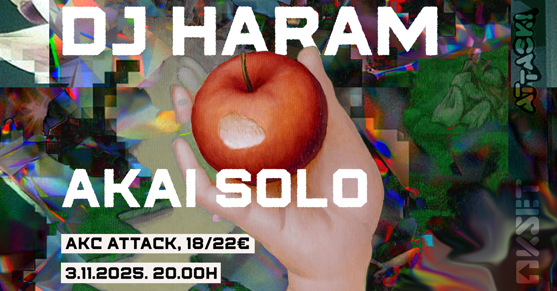 U ponedjeljak, 3. studenoga, KSET ti dovodi DJ Haram i AKAI SOLO u AKC Attack, dvije iznimno uzbudljive figure suvremene eksperimentalne i hip-hop scene. Čeka te večer na granici eksperimentalne elektronike, noisea i underground hip-hopa, gdje se briše linija između klupske glazbe i avangardnog zvučnog eksperimentiranja. DJ Haram i AKAI SOLO donose jedinstvenu energiju koja spaja sirovu urbanu poetiku s inovativnom produkcijom koja pomiče žanrovske granice.