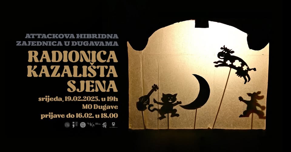 Attackova hibridna zajednica | Radionica kazališta sjena Srijeda, 19.02.2025. od 18.00 sati MO Dugave, Ulica Sv. Mateja 93 Treći ciklus Attackove hibridne zajednice uvodi novi program kazališnih radionica za odrasle, pružajući jedinstvenu priliku za kreativno izražavanje i istraživanje kroz tehnike kazališta sjena. Radionički ciklus započet će u srijedu 19. veljače 2025. Od 18.00 sati u prostoru Mjesnog odbora Dugave, Ulica Sv. Mateja 93. Ove dramske radionice, vođene iskusnim dramskim pedagoginjama, stvaraju sigurno i poticajno okruženje gdje je svaki sudionik slobodan izraziti se bez straha od osude ili predrasuda. Kroz igru svjetla i sjene, polaznici/e će razvijati govorništvo, kreativno izražavanje, samopouzdanje i svijest o vlastitom tijelu i glasu u prostoru. Radionice su osmišljene kao proces u kojem se istražuju emocije, stavovi i društveni tabui, a kroz dramske igre i improvizacije sudionici će graditi zajedničke priče i scenske prikaze. Program uključuje individualni rad, rad u parovima i grupne improvizacije, a završava prezentacijom nastalog rada. Ako želite sudjelovati u razvijanju svoje kreativnosti kroz tehnike kazališta sjena, razvoju i jačanju dramskog izričaja, okušati se u procesu osmišljavanja kazališne predstave, pridružite nam se u ovom šestotjednom ciklusu radionica i otkrijte snagu kazališta sjena! Sudjelovanje na radionicama je besplatno uz obaveznu prijavu na poveznici 👉 https://shorturl.at/k0dGr Prijave primamo zaključno sa 16.02. u 18.00. Potvrdu sudjelovanja dobiti ćete nakon zatvaranja prijava. Voditeljice radionica su članice kazališta sjena Tripstih. Program Attackova hibridna zajednica nastao je kao rezultat suradnje AKC - a, s pojedinim članovima zajednice u Dugavama, koji se kroz godine trude oživjeti društvene i kulturne programe u tom naselju. Opći cilj projekta je omogućiti kulturne sadržaje u dijelovima grada koji su do sada isključeni iz trendova realizacije kulturnih dešavanja. Projekt se provodi kroz program Kultura u zajednici, kojeg financira Grad Zagreb, u partnerstvu s MO Dugave, Teatrom Puna kuća, Centrom za primjenu integriranog znanja ANZIP.