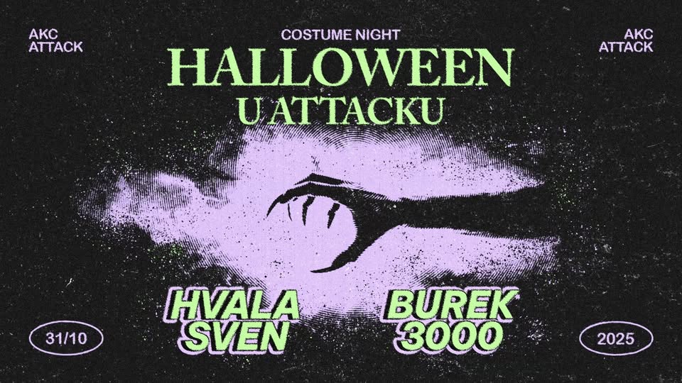 Pripremite se za najjeziviju, najplesniju i najluđu noć u godini u AKC Attacku! Za DJ pult dolaze burek3000 i Hvala Sven, spremni rasplesati podzemlje uz arsenal balkanske glazbe najstrašnijeg world-musica koji će nas držati na nogama cijelu noć. A da sve bude još više vruće i čarobnije, pripremili smo i vještičji fire show. Kolektiv @the.pyretess plamenom, plesom i magijom obasjat će crne zidove Attacka. Dođite maskirani i naožurani dobrom energijom. Bad vibe je strogo zabranjen!