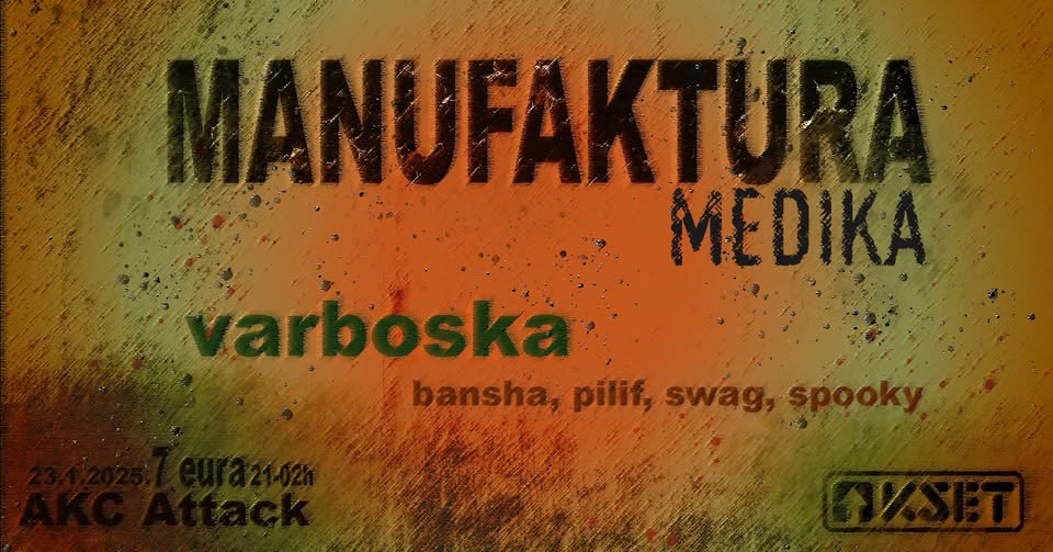 Disco sekcija KSET-a predstavlja Manufakturu Medika na prostoru poznatog AKC Attacka. Očekuj mračnu atmosferu i mehaničke ritmove, a od 21 do 2 h slušamo baš sve, od noisea, industrijski orijentiranog power electronicsa, pa sve do dekonstruirane klupske glazbe. DJ-evi bansha, pilif, spooky i swag iz Disco sekcije KSET-a, uz headlinera varbosku će biti zaduženi za totalno napadanje vaših bubnjića nasiljem u auditornom obliku, uz popratne industrijske vizuale KSET-ovih VJ-eva. Ulaz je 7 eura. Vidimo se 23.1. u AKC Attacku! Dizajn: Doria Herceg // Media sekcija KSET-a