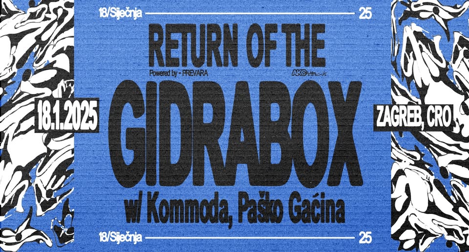 AKC Attack ponosno predstavlja: / ̌ ́ & SUB, 18.1. | 22:00 - 06:00 | 10 EUR Dva Zadrana, međusobno udaljena stotinama kilometara, odlučuju jedne prohladne januarske noći vratiti stari sjaj Gidrabox imena. Zavidno poznavanje EBM i electro materije, u novije vrijeme i njegovanje masnih bass žanrova te strogi estetski kriteriji kojima se vode pri odabiru neke su od odlika koje krase Gidrabox. Sa svojim su prepoznatljivim b2b setovima rado viđeni gosti svih iole ozbiljnijih, a pogotovo neozbiljnih klubova, DIY zabava i festivala, stoga i ne čudi da u svojoj biografiji imaju zapisane nastupe u većini zagrebačkih klubova, splitskoj Kocki, zadarskoj Nigdjezemskoj, Blast festu i mnogim drugim. Ovaj su event kurirali prema vlastitoj viziji onoga što klupska večer je i mora biti, a to je, prije svega, naglasak na kvalitetnoj glazbi i dobrom zvuku, pa tek onda zabava. Zato kao podršku dovode dva provjerena imena i ̌ ́. SC:https://soundcloud.com/user-720145076 Paško niže globalne uspjehe sa svojim punk bendom Mižerija zbog čega ga dugo vremena nismo imali priliku vidjeti za DJ boothom ili nekom od varijanta svojih prepoznatljivih live-actova. Zato je ovaj event jedinstvena prilika da se uvjerimo u Paškovu virtuoznost, neovisno o tome ima li u rukama bas, DJ mikser ili nešto treće! SC:https://soundcloud.com/paskogacina Kommoda je čest gost partija u Medici i preostalih zagrebačkih klubova. Glazbeni interes mu je eklektičan, pa ga pod istim imenom možemo slušati na psy eventima, electro i techno partijima, ali i ugledati ispred sounda na dub sessionima ili u pogu na pank gigovima! Volimo kad DJ-evi imaju raznolike interese jer nam uvijek dostave nepredvidive setove, a upravo to očekujemo od Kommode u subotu. SC:https://soundcloud.com/komodant Za potpuni audio doživljaj pobrinut će se koji će nam sa svojim 21" hog-scoopsima omogućiti da čujemo i najniže note. Flyer by @milasara