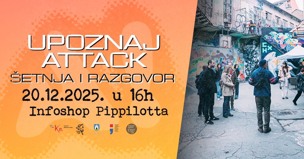 AKC Attack otvara vrata za šetnju prostorom u subotu 20.12.2025. u 16:00 sati. Ovo je jedinstvena prilika da zavirite u neke prostore za koje do sada niste znali da postoje! Osim svima poznatog mjesta kluba Attack, mjesta za glazbene programe i noćne izlaske, postoje i drugi prostori u kojim se odvija niz programa kroz koje će vas prošetati Neven Aljinović Toth, jedan od dugovječnijih članova udruge Attack. Vođena šetnja upoznati će vas s poviješću same udruge AKC Attack, s infrastrukturom, modelom upravljanja, konceptom programa i svime što sami/e želite dodatno znati.