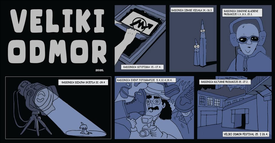 Radionica je namijenjena srednjoškolcima/kama koji/e imaju želju naučiti idizajnirati vizualna rješenja za događanja i staviti ih na format plakata te formate za društvene mreže. Na radionici polaznici/e će se upoznati s temeljnim teorijskim postavkama dizajna plakata te će imati priliku zajedno s voditeljicom osmisliti vizualno rješenje za festival “Veliki odmor” koji će se održati 25. i 26. travnja. Nakon izrade zajedničkog vizualnog rješenja, sudionici će uz mentorsku podršku izraditi svoju verziju plakata koja će biti izložena u galeriji Siva tokom trajanja festivala. 📌Detalji i prijava: https://forms.gle/hKPKPH15GVNNvAcC9