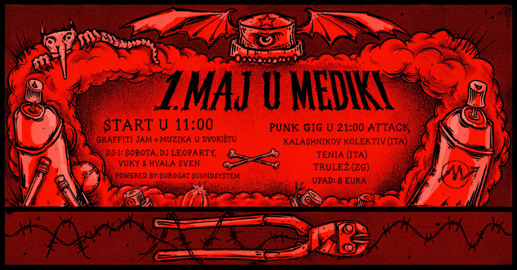 Ujedinjene snage Attacka, Grey Room kolektiva i Surogata pozivaju vas na cjelodnevno druženje povodom 1. maja u Mediki. Program počinje već u 11 sati u dvorištu, gdje će zidove Medike preuzeti graffiti majstori i promijeniti nam vizualne kulise. Uz graffiti jam, za glazbeni dio pobrinut će se naši kućni DJ-evi i njihovi prijatelji na Surogat soundu. DJ Subota, DJ Leoparty, Jah Vuki pobrinuti će se da dvorištem odjekuju ugodne note različitih vrsta glazbe za sve ljubitelje plesnih ritmova i glazbene sladokusce.