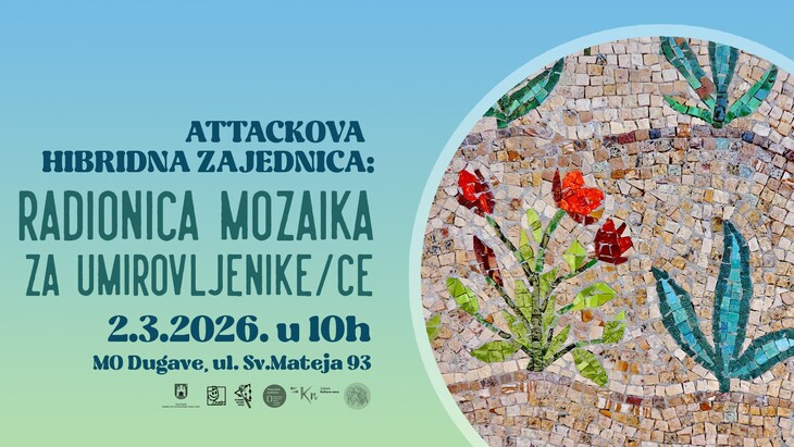 AKC Attack poziva sve zainteresirane umirovljenike/ce da nam s e pridruže na radionici izrade mozaika koja će započeti svoj ciklus u ponedjeljak 02. ožujka 2026. od 10:00 u prostoru Mjesnog odbora Dugave, Ulica sv. Mateja 93. Radionica je potpuno besplatna i otvorena za sve zainteresirane – bez obavezne prijave!