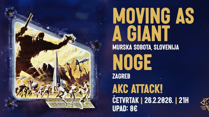 Večer teških riffova, gustih atmosfera i zvuka koji udara ravno u želudac i srce očekuje vas u klubu Attack, u četvrtak 26.02.2026. Pripremili smo vam pravu noise/fusion/ punk poslalsticu s gostima Noge i Moving As a Giant.