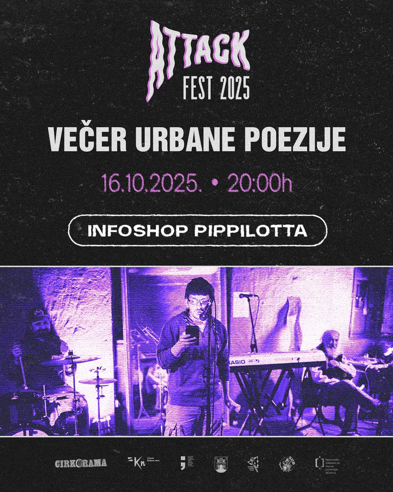 Pridruzite nam se na otvorenju 𝛢𝑡𝑡𝑎𝑐𝑘 𝐹𝑒𝑠𝑡-a u Infoshopu Pippilota na najposebnijem programu, 𝑉𝑒𝑐𝑒𝑟 𝑢𝑟𝑏𝑎𝑛𝑒 𝑝𝜊𝑒𝑧𝑖𝑗𝑒 s Nevom Aljinovićem!