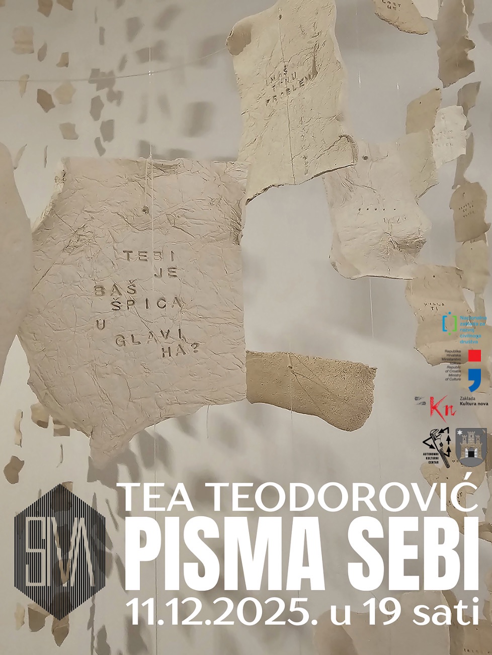 Autonomni kulturni centar Vas kroz program Galerije Sive poziva na izložbu “Pisma sebi” umjetnice Tee Teodorović. Otvorenje je predviđeno za četvrtak 11. prosinca u 19 sati u Medici (Pierottijeva 11, Zagreb). Izložba je otvorena do srijede 17. prosinca svaki dan od 17 do 20 sati.