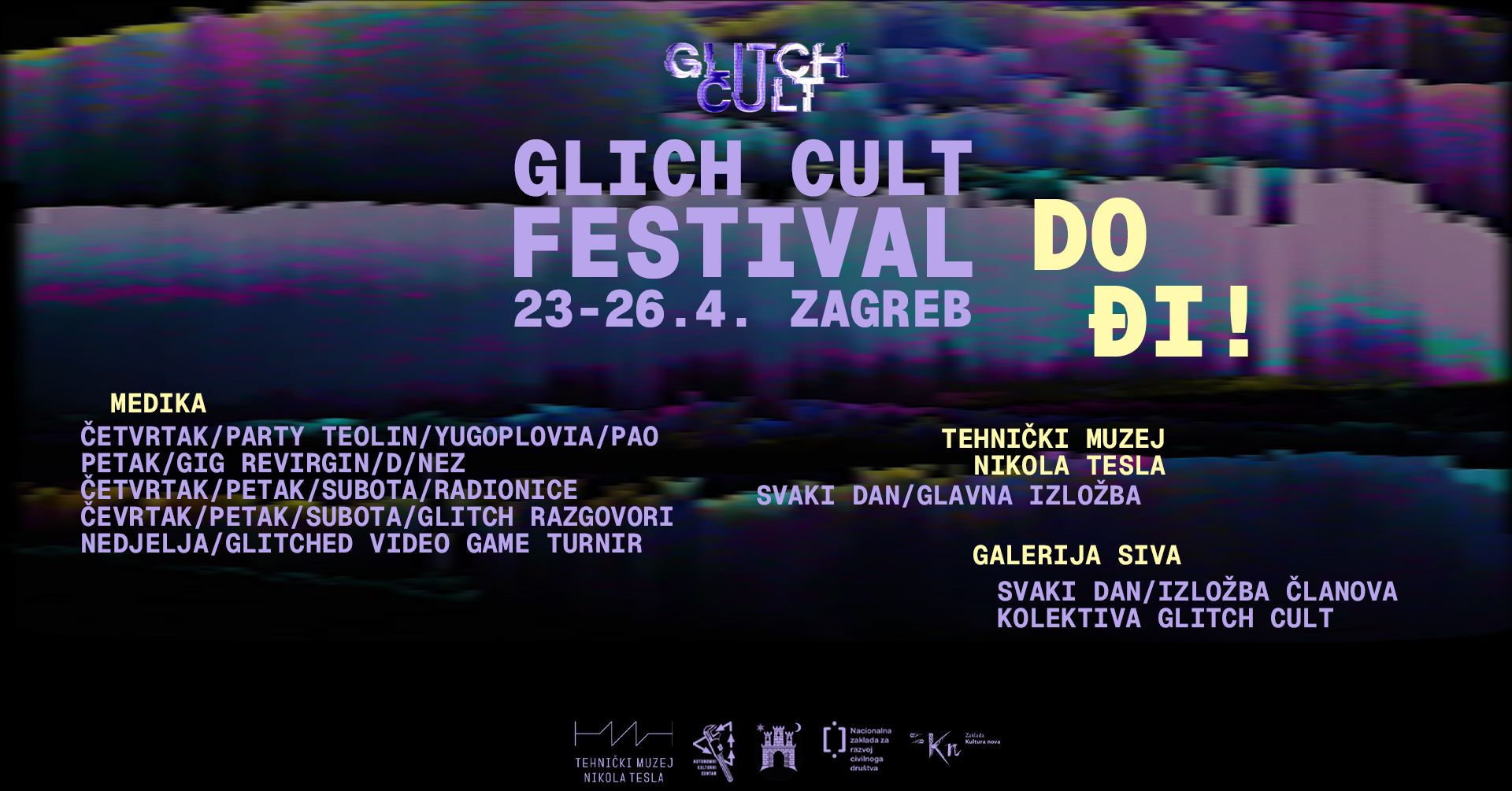 Glitch Cult festival financijski je podržan od strane Grada Zagreba - Gradski ured za kulturu i civilno društvo, Nacionalne zaklade za razvoj civilnoga društva i Zaklade Kultura nova