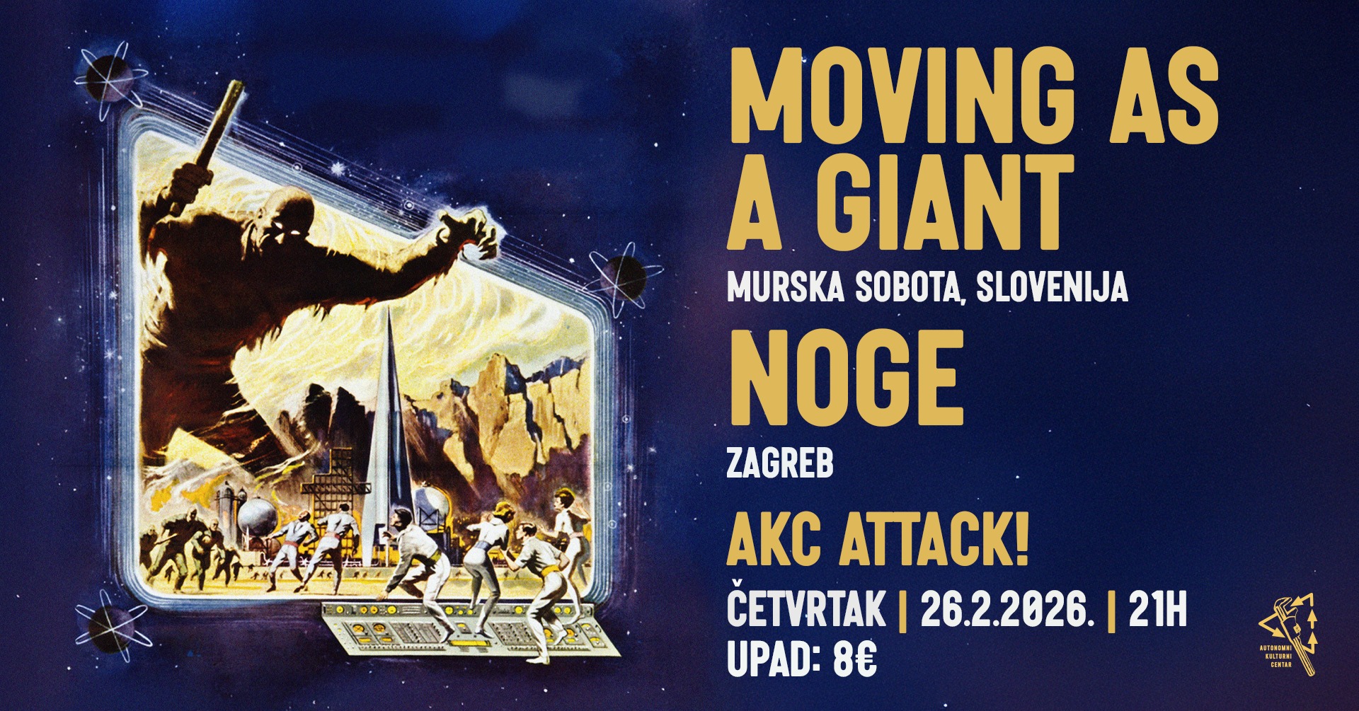 Večer teških riffova, gustih atmosfera i zvuka koji udara ravno u želudac i srce očekuje vas u klubu Attack, u četvrtak 26.02.2026. Pripremili smo vam pravu noise/fusion/ punk poslalsticu s gostima Noge i Moving As a Giant.